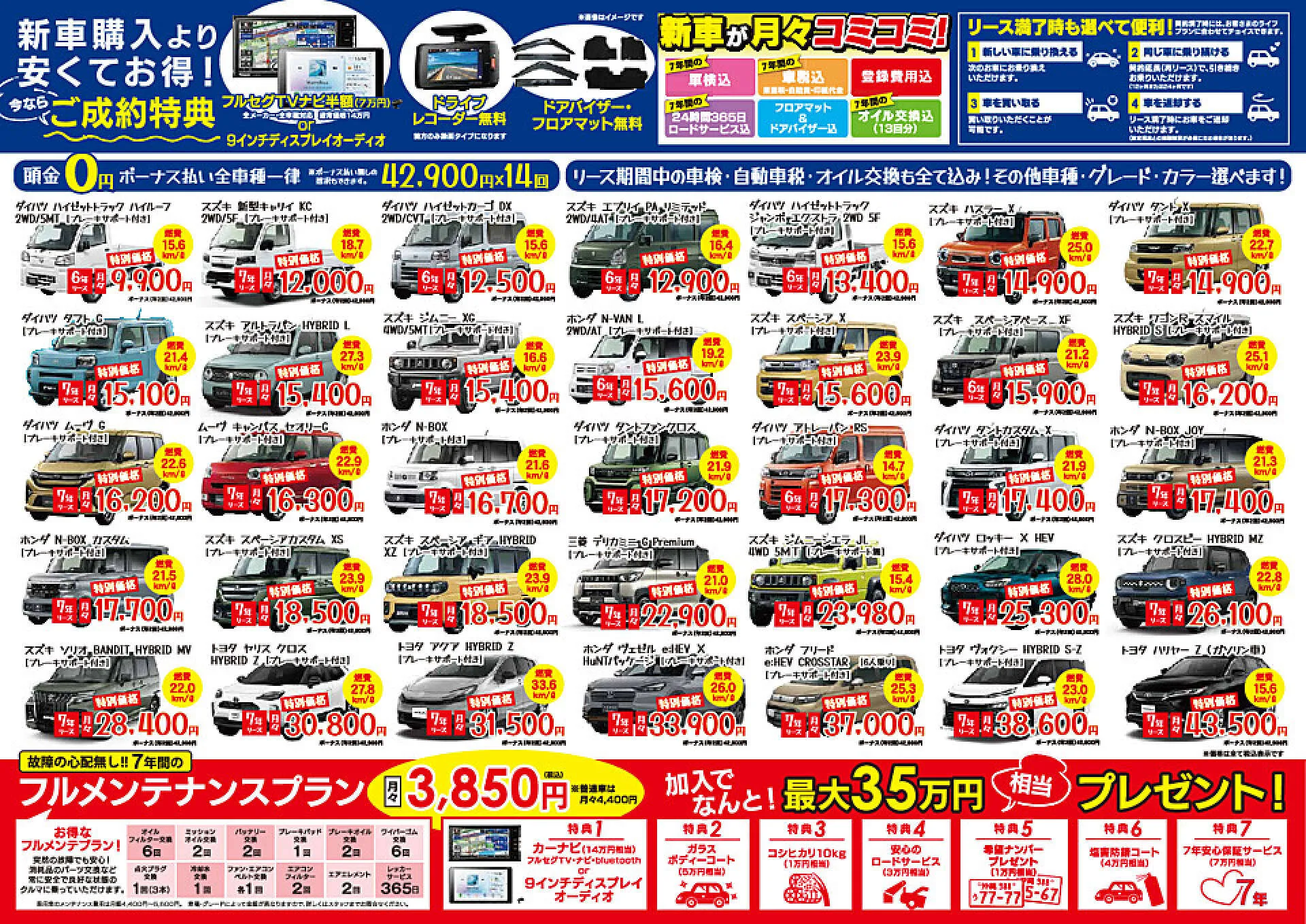 北谷町のカーショップアースでは、月々1.1万円~(※ボーナス併用時)で、自動車税・車検・メンテナンス費用コミコミのカーリースをご提供しております。