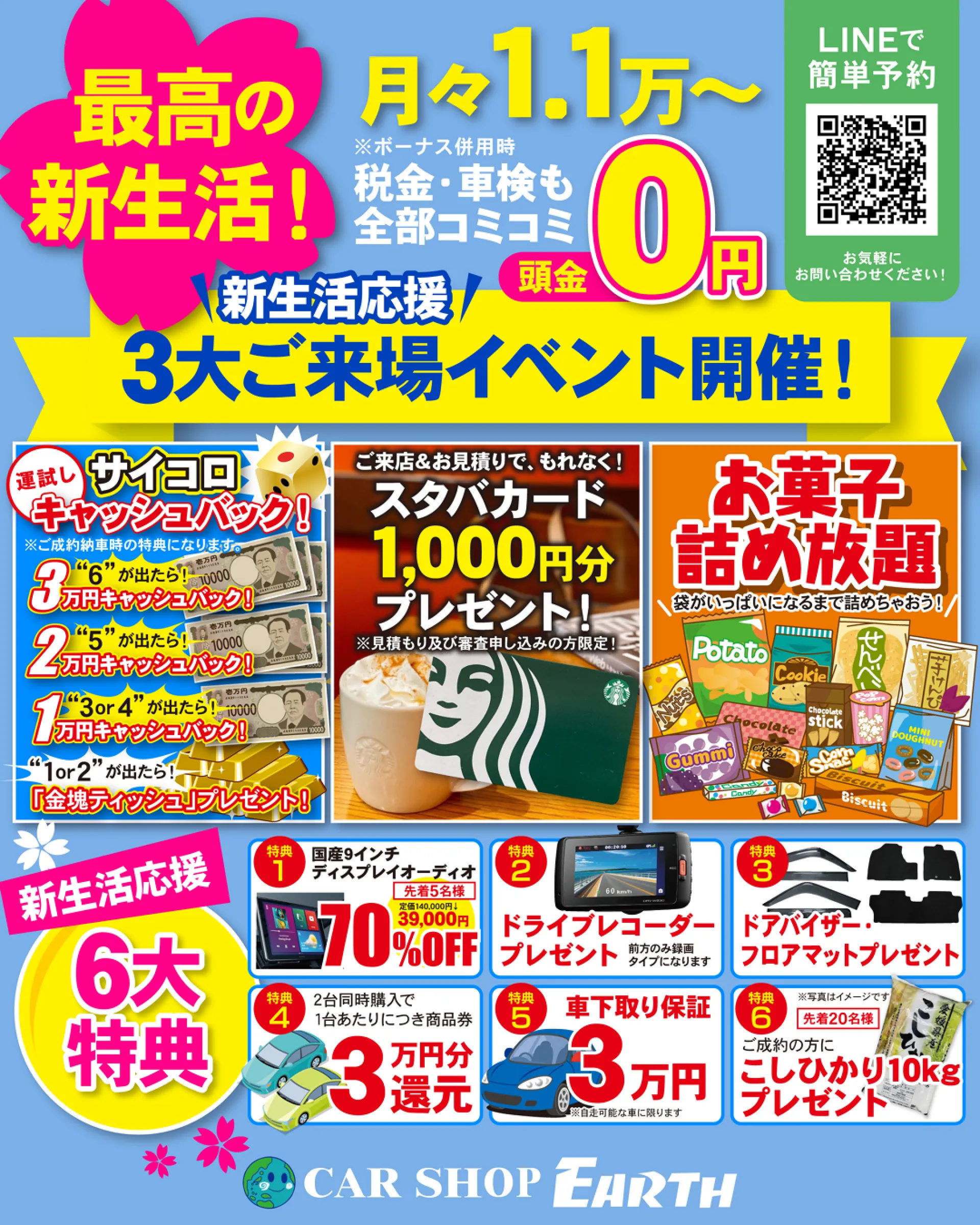 今、カーショップアース(北谷町)では、新生活をスタートされる方を応援するための期間限定・ご来場イベントを開催しております!